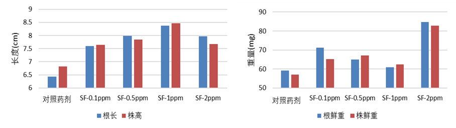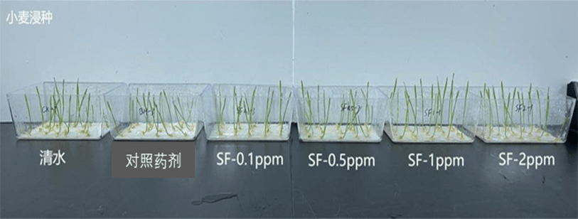 (2)針對小麥作物:浸種處理后發現,試驗范圍內的花粉多糖對小麥株高、根長、株重、根重均具有促進作用,其中在2 ppm處理下,相比陽性對照處理,花粉多糖處理后小麥株高、根長、株重及根重分別增長12%、24%、45%、43%。